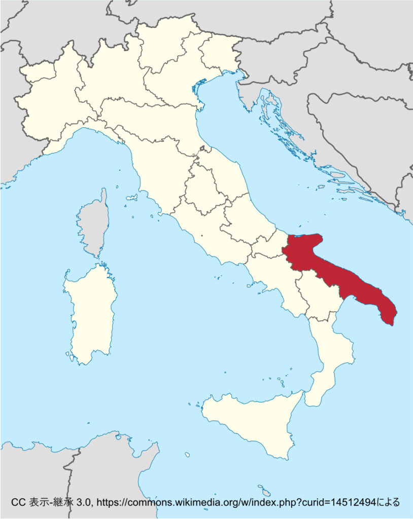 プーリア州はイタリア半島を長靴に見立てると、踵のあたりに位置します。